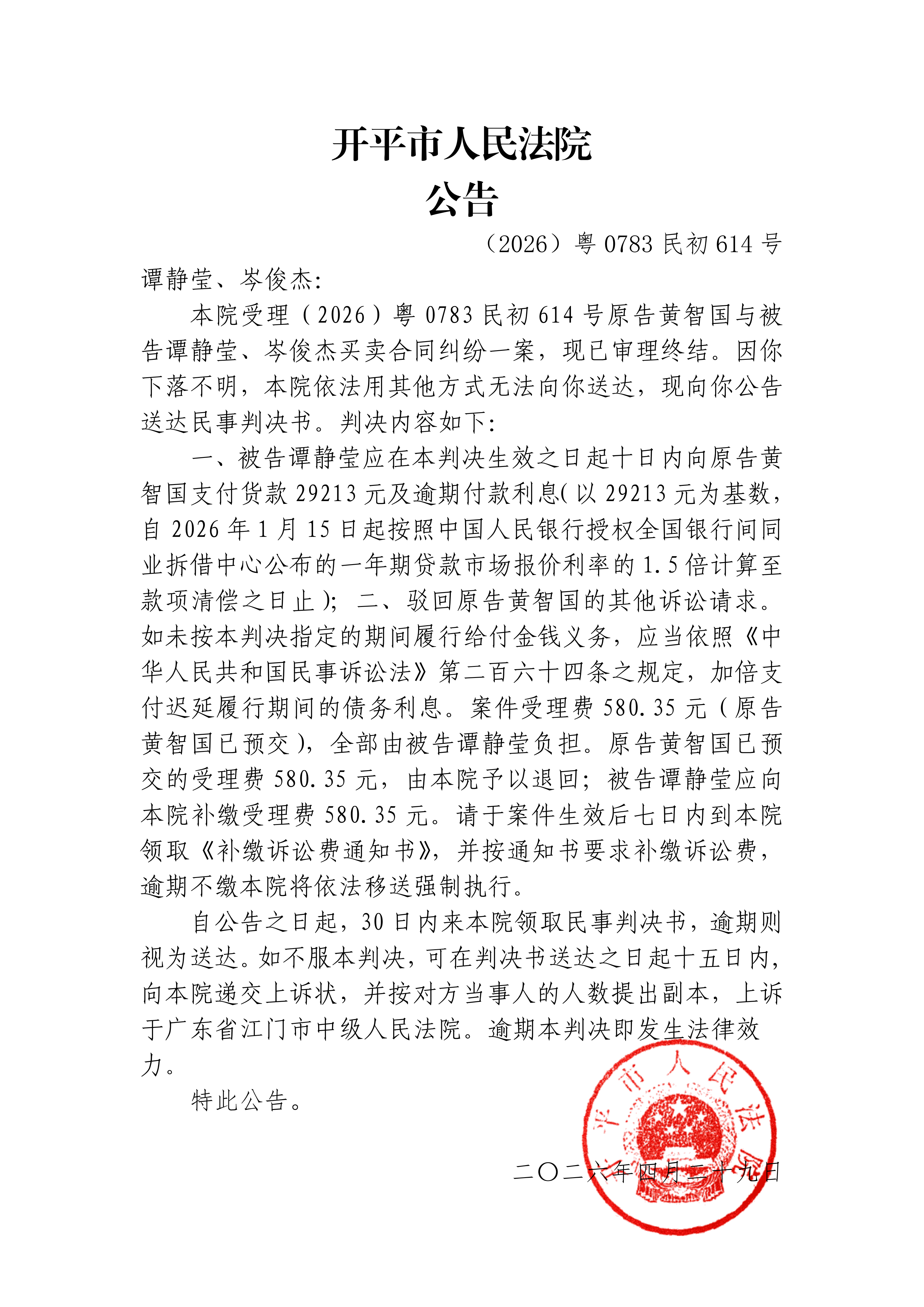 附件:(2026)粤0783民初614号 谭静莹、岑俊杰 判决公告.pdf