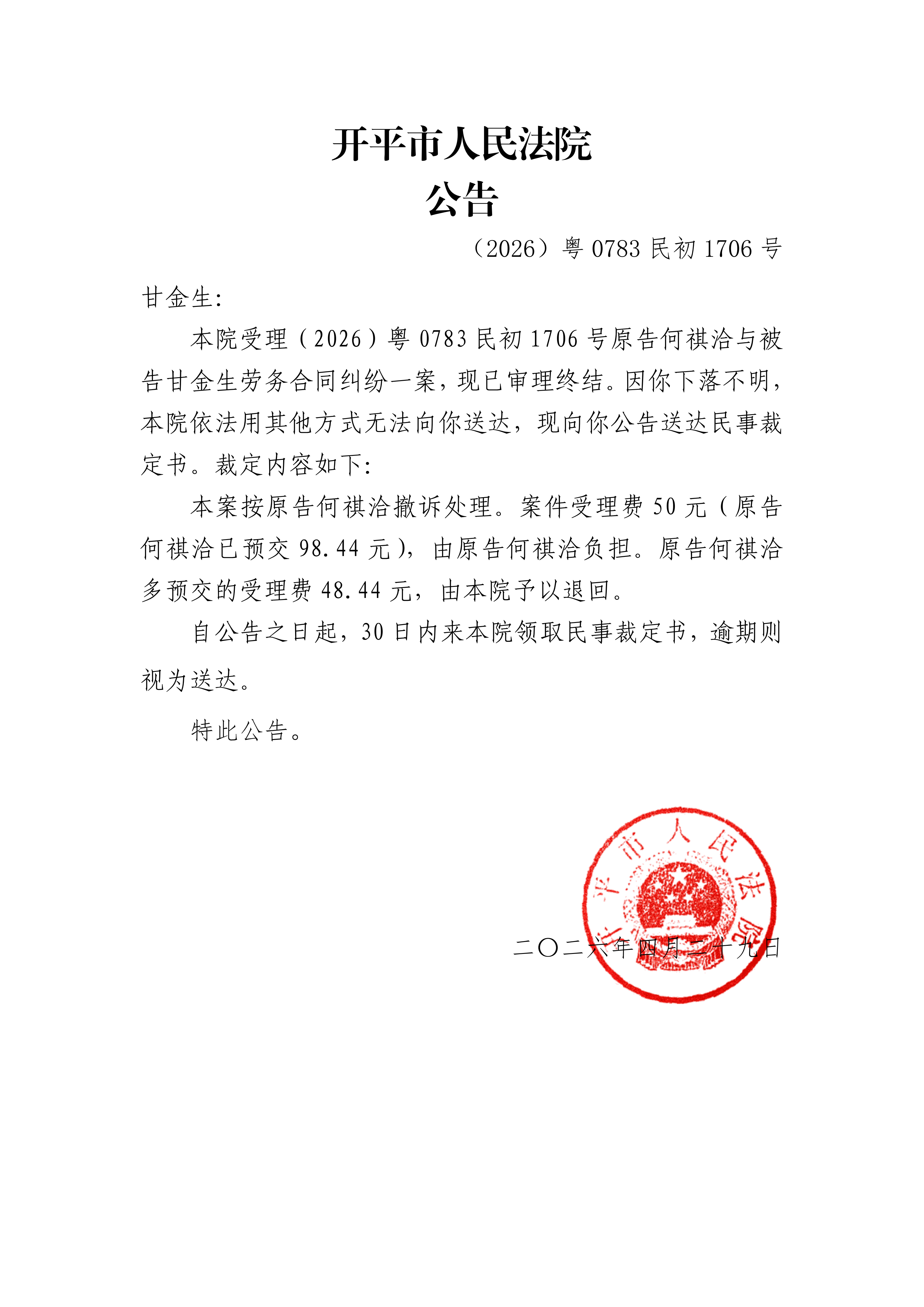 附件:(2026)粤0783民初1706号 甘金生 裁定公告.pdf